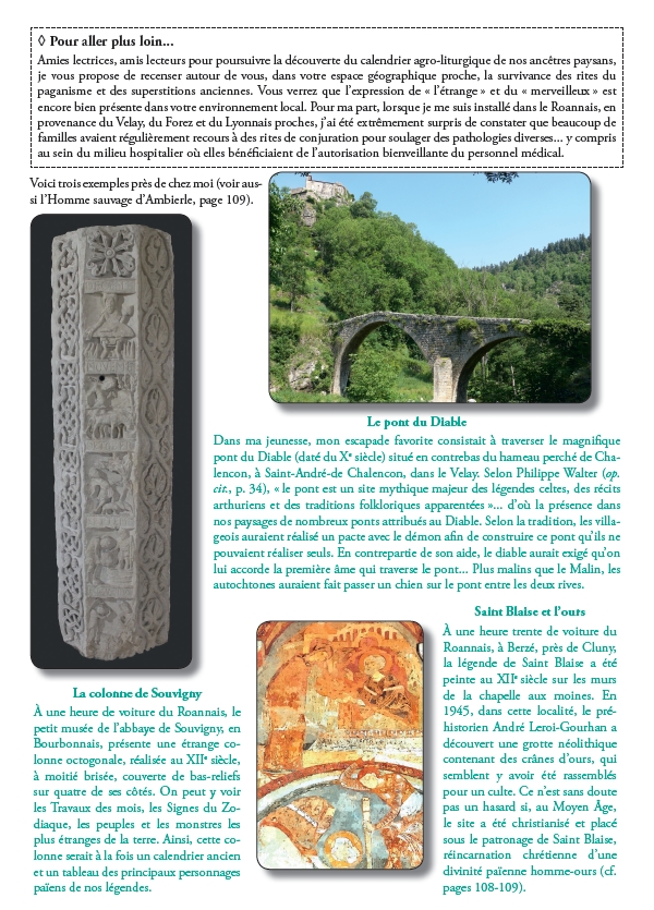 Par chance, malgré la distance, ce monde enfoui est encore perceptible pour qui veut bien se donner la peine de gratter le vernis du temps et de faire quelques recherches dans les archives, les grimoires, les ouvrages techniques des anciens agronomes, les revues des sociétés savantes et les ouvrages des folkloristes du XIXe siècle. Il l’est aussi dans le travail de certains de nos agriculteurs actuels qui, avec leurs moyens modernes, retrouvent et perpétuent le langage et le savoir-faire de leurs lointains ancêtres paysans. Il l’est également dans la mémoire des lieux et dans nos paysages si l’on prend le temps de lire dans la pierre le témoignage des pardons sacrés, des croix processionnelles, des fontaines miraculeuses, des mégalithes levés, des ponts du Diable et autres monuments teintés de superstition. Il l’est encore si l’on interprète les légendes dorées des saints comme la survivance païenne de l’ancienne mythologie antérieure au christianisme. Il l’est enfin si l’on admet que toutes nos fêtes religieuses sont venues recouvrir d’un voile chrétien les anciennes fêtes païennes dont l’origine et la signification plongent dans la nuit des temps antiques : celtique et romain.